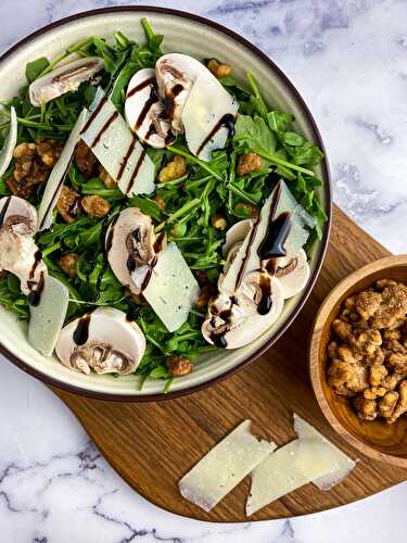 Mushrooms, Pecorino & Candied Nuts are the perfect match in an arugula salad (earthy, salty, sweet and bitter!).