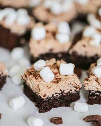 Lots of light and fluffy cocoa frosting, mini marshmallows, shaved chocolate paired with the most wonderful fudgy, cake-like brownies that you'll fall head over heels over.