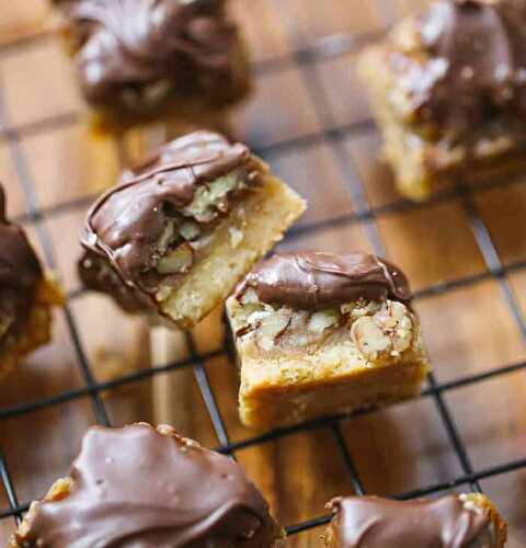 These addictive, rich and gooey chocolate covered pecan pie bars are perfect for holiday baking and entertaining for a crowd!