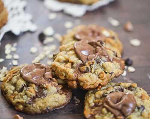 These are a wonderful combination of sweet, buttery, chewy butterscotch, white chocolate and semi-sweet chocolate chip oatmeal cookies topped with a heaping melted hazelnut truffle on top.
