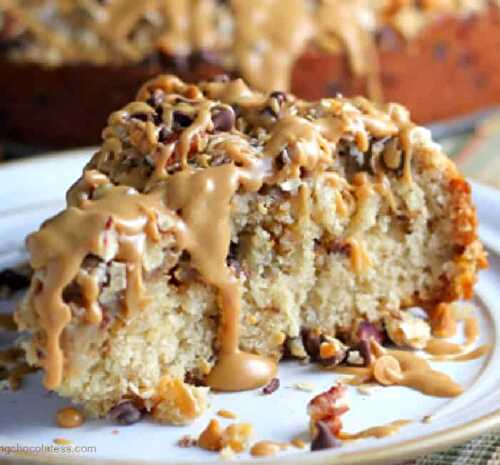 Chocolate Chip & Peanut Butter Oatmeal Cake is hearty and delicious! This coffee cake is loaded with chocolate and peanut butter chips and peanut butter drizzle! YUM!! Somebody stop me! NO.