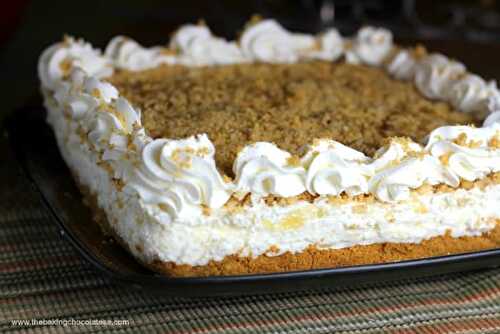 Delicious fluffy, whipped cream & cream cheese pineapple dessert with a graham cracker crust.