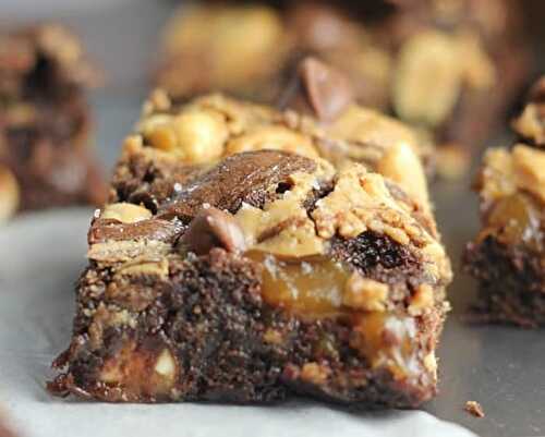 Take indulgent, fudgy chocolate brownies to the next level with Snicker bars, and top it with a layer of caramel, peanut butter, milk chocolate chips, roasted peanuts and a generous sprinkle of sea salt.