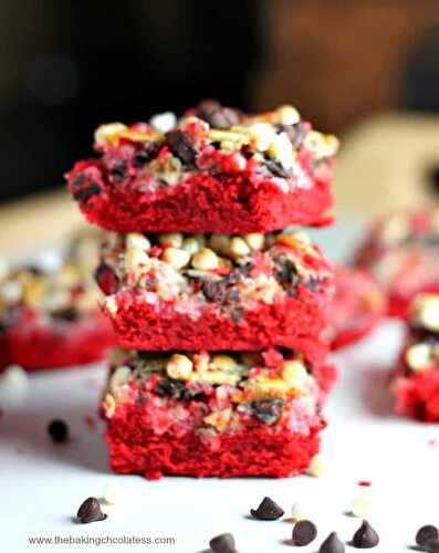 Vibrant Red Velvet Cake Bars loaded with layers of White Chocolate, Dark Chocolate, Coconut and Almonds!