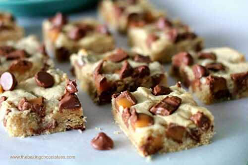 These sweet, snazzy cookie bars are jam packed with bits of creamy Butterfinger Chocolate Bar, oozing Milky Way Caramels and topped with rich milk chocolate chips.