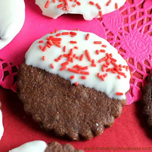 Soft, rich, intense chocolate cut-out sugar cookies drenched in white chocolate and sprinkles! Happy, Happy, Joy, Joy!