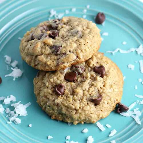 Thick and chewy delish cookies infused with coconut oil and loaded with chocolate chunks, coconut and oats.