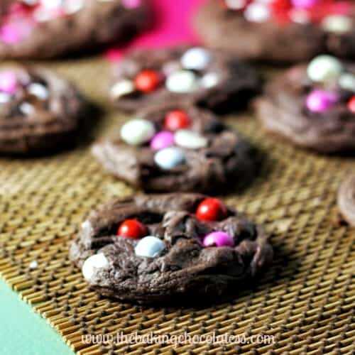 These rich chocolate cookies are moist, fudgy and decadent and loaded with Sixlets Candy and chocolate chips galore!! It's Chocolate Heaven in a cookie!!
