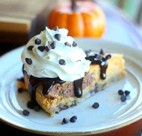 Pumpkin & Chocolate swirled together in this creamy, luscious cheesecake with a Chocolate Chip Cookie Dough crust! Top it off with some hot fudge, whipped cream and chocolate chips! You're good to go!