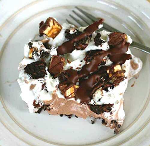 Heavenly, decadent, luscious chocolate and peanut butter fluff dessert for any season! OREOS and Peanut Butter Snickers bits and chocolate and peanut butter drizzle take this sinful delight over the top!