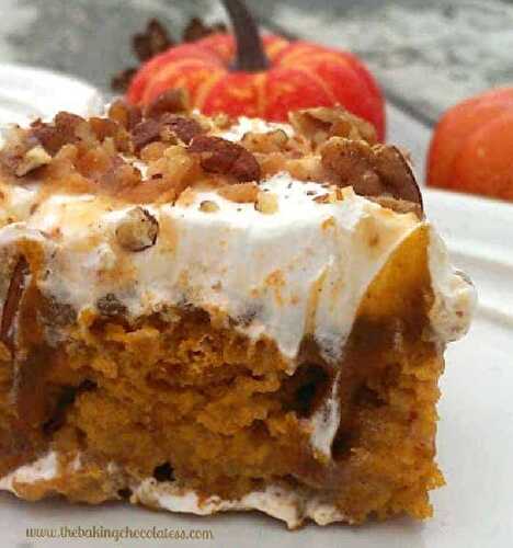 Pumpkin & butter pecan cake drenched in a sweetened condensed milk, caramel sauce and pumpkin pudding, topped off with fluffy clouds of whipped cream, buttery toffee bits and pecans.