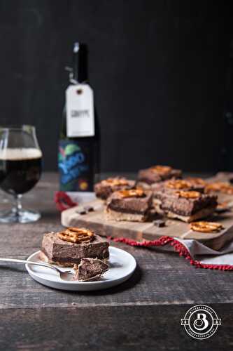 Chocolate Stout Truffle Mousse Bars with Pretzel Crust At a beer event in a crowded bar in Portland, Oregon last week I talked to a talented brewer about his participation in an upcoming brewing competition.