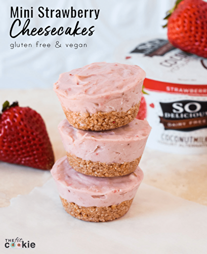 These delicious Mini Dairy Free Strawberry Cheesecakes are the perfect gluten free and vegan cheesecake, with no artificial flavors or colors!Gluten free, vegan, nut free; Free of: soy, dairy, eggs, peanuts