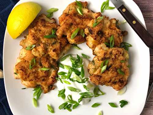 These chicken fritters with green onion and sour cream are crispy, golden brown on the outside, and tender and moist on the inside.