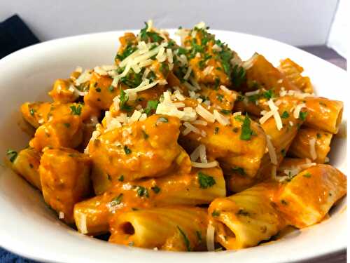 This rigatoni with chicken in rose sauce is creamy and deliciously satisfying.