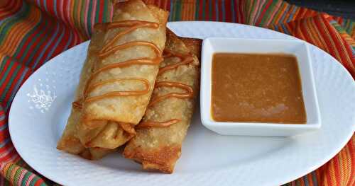 Caramel Drizzled Apple Pie Egg Rolls are the "in" thing to serve friends and family this fall! Loads of flavor and a caramel dipping sauce to push them over the top!