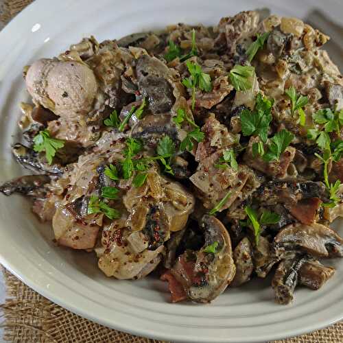 Rabbit Fricassee is an easy classic dish with mushrooms and cream that can also be made with chicken