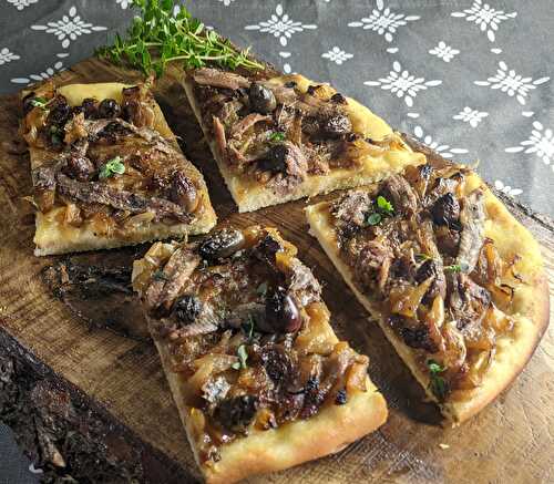 Pissaladière with a sour dough base - classic French dish of onions, anchovies and olives