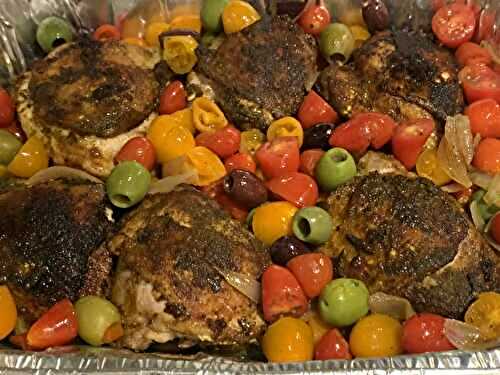 Tomato-Olive Mediterranean Chicken Thighs In this one-pan meal, freshly seared chicken thighs simmer in their own juices alongside bursting tomatoes and salty olives to complete this Tomato-Olive Chicken Thigh dish.