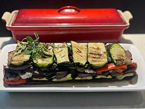 An assortment of grilled vegetables including eggplant, zucchini, red onions, mushrooms, red bell peppers and spinach all layered together with goat cheese.