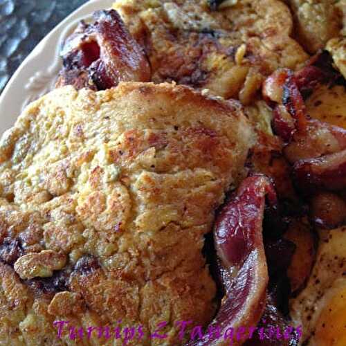 Enjoy Sourdough Blueberry French Toast with bacon and Mulberry Syrup.