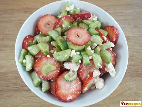A cold served quinoa salad with chicken, bacon, avocado, red onion and a garlic honey lime dressing.
