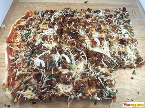 Chicken, artichoke hearts, red onion, black olives and feta cheese on a crispy garlic crust.