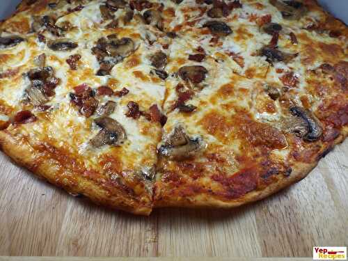 A homemade pizza crust topped with a fresh tomato sauce, a mix of mozzarella, provolone, and Parmesan cheeses, and loaded with beef meatballs.