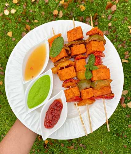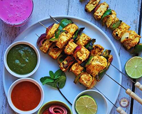 Indian cottage cheese (Paneer) marinated in Indian spices and baked or grilled to deliciousness.