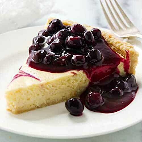 A smooth, tangy lemon tart made with a cream cheese filling and swirled with a vibrant blueberry sauce, all baked into a crisp, buttery shortbread crust.