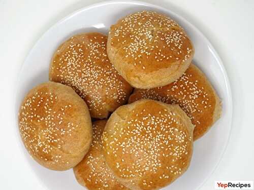 Soft homemade hamburger buns made with a mix of whole wheat flour, bread flour, milk, butter, and egg then baked topped with sesame seeds.