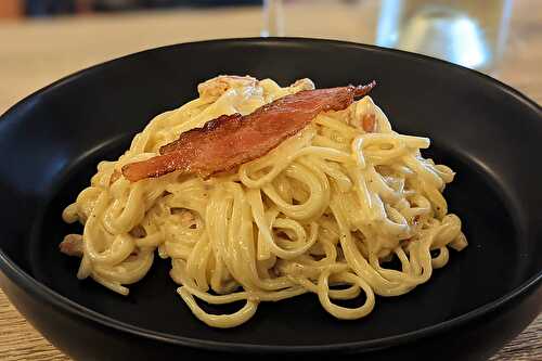 This simple and easy eggless Spaghetti Carbonara features creamy parmesan cheese and crispy bacon.