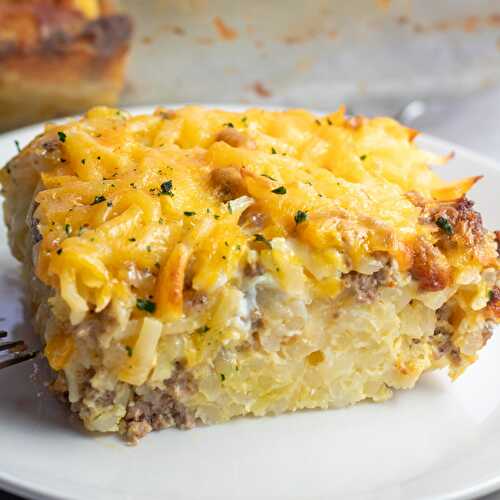 My hearty tater tot casserole with breakfast sausage is loaded with all of your breakfast favorites in a comforting one-pan breakfast.