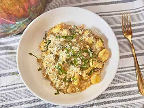 Slow Cooker Sausage & Gnocchi Pizza Casserole - with tender gnocchi, Italian sausage, marinara, and mozzarella, it's a saucy, cheesy, crowd-pleaser! Customize it with your favorite pizza toppings!