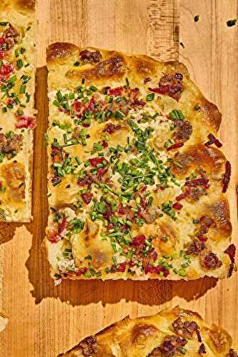 Make the viral Sausage and Chive Focaccia from Radio Bakery at home! This focaccia has a soft, airy crust topped with Italian sausage, bacon, crème fraîche, and fresh chives.
