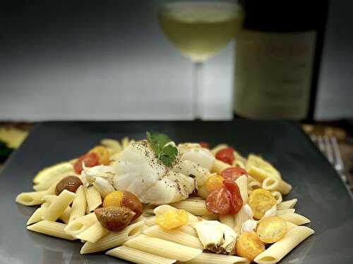 Flaky baked cod nestled in a warm stew of cherry tomatoes, cannellini beans, shallots, olives, and garlic.