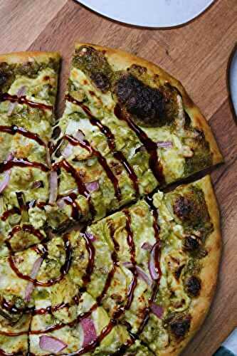 This pesto ricotta pizza is equal parts delicious and unique, featuring artichokes, onion, grilled chicken, and balsamic glaze.