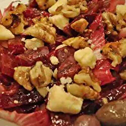 This beautiful edible arrangement is comprised of ruby endive, arugula, brown sugared pecans, thinly sliced apples, seasonal figs and Boursin cheese.