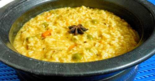 Chunky, hot and spicy curry coconut gravy with yellow split peas and TVP (soya chunks).