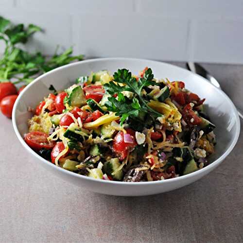 Sweet roasted butternut squash is stuffed with a pre-cooked Mediterranean filling inspired by the traditional Greek Spanakorizo aka Spinach and Rice.