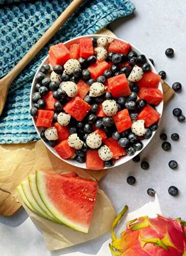 This Easy and Fresh Summer Fruit Salad is made with just six simple ingredients! It features juicy watermelon and blueberries, fun dragon fruit, and cozy cinnamon.