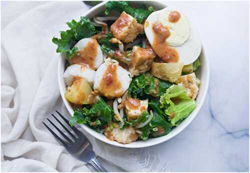 Simple fig & green pea salad with tofu feta and maple mustard dressing.