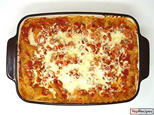 A pasta casserole layered with lasagna noodles, a tangy ground beef tomato sauce with onion and mustard, and plenty of sharp cheddar and cottage cheese.