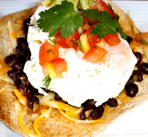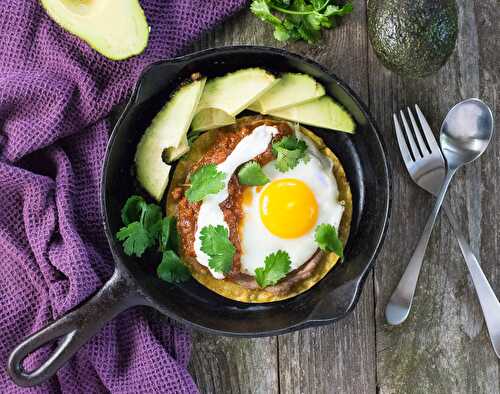 A spicy chipotle spin on a classic Mexican breakfast with corn tortillas, jalapeño refried beans, warm smoky chipotle salsa, topped with a fried egg and cilantro.