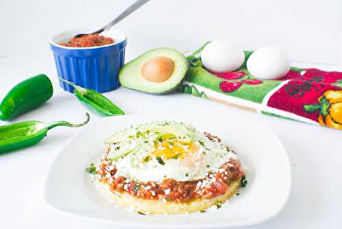 Huevos rancheros is a keto and gluten free version using a fathead dough incorporating jalapeños, layered with chili and topped off with your favorite style of eggs.