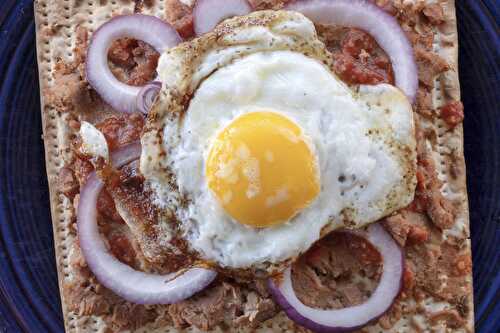 This crispy matzo based breakfast is a cross between molletes and huevos rancheros.