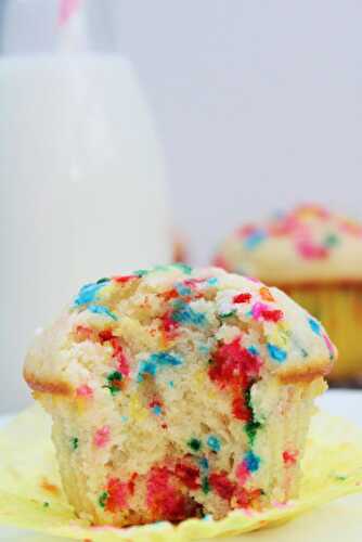 These funfetti muffins are the perfect birthday treat! Skip the messy frosting or icing and make these cute muffins for the kids instead! They're soft, moist and loaded with rainbow sprinkles!