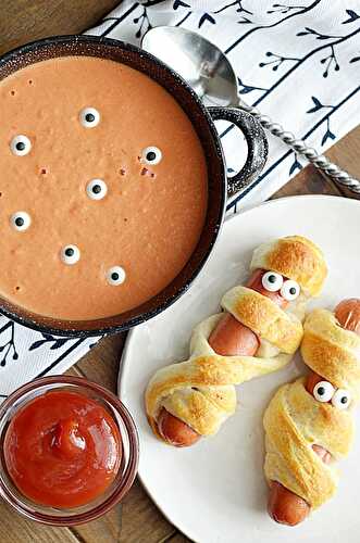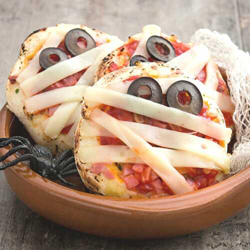 This Halloween baked cheese mummy recipe features flaky puff pastry wrapped around melted cheese and pepperoni! They are covered in strips of puff pastry and candy eyes to make them look like adorable and festive mummies! Serve them at your next Halloween.