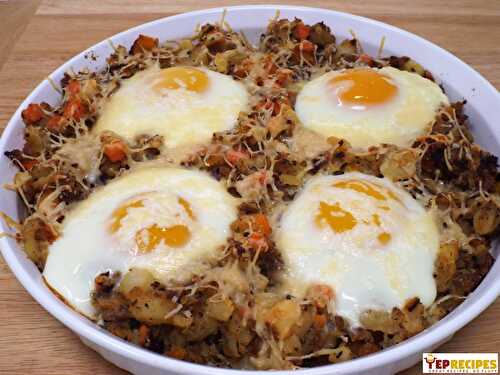 Italian sausage, potatoes, onions, and carrots fried together then baked topped with eggs and Parmesan cheese.