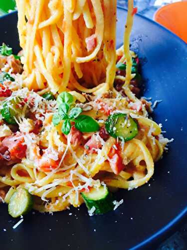 Fresh linguini with baby courgettes, chestnut mushrooms and pancetta, a super delicious pasta recipe made with homemade tomato juice and topped with an indulgent sprinkle of parmesan cheese.